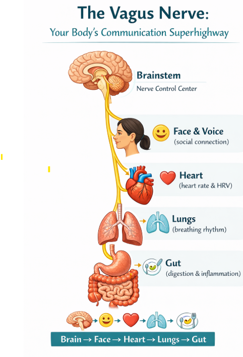 Enter the vagus nerve. Known in the medical world as the "wandering nerve," it is the superhighway of communication between your brainstem and your major organs—your heart, lungs, and digestive tract.